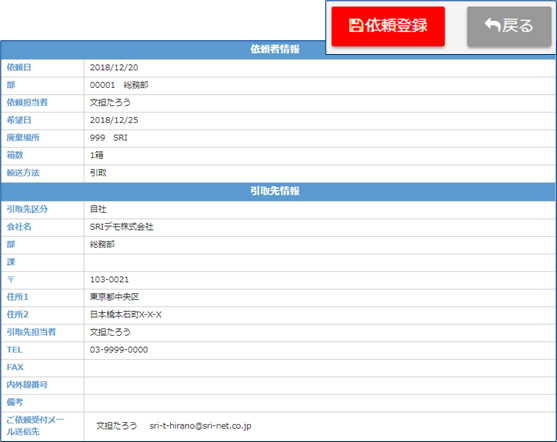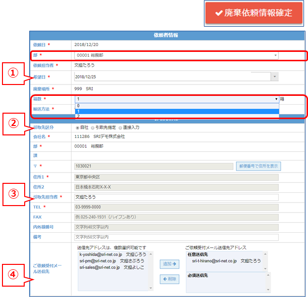 部の選択および箱数を入力し、依頼者情報および引取り先情報を入力し、