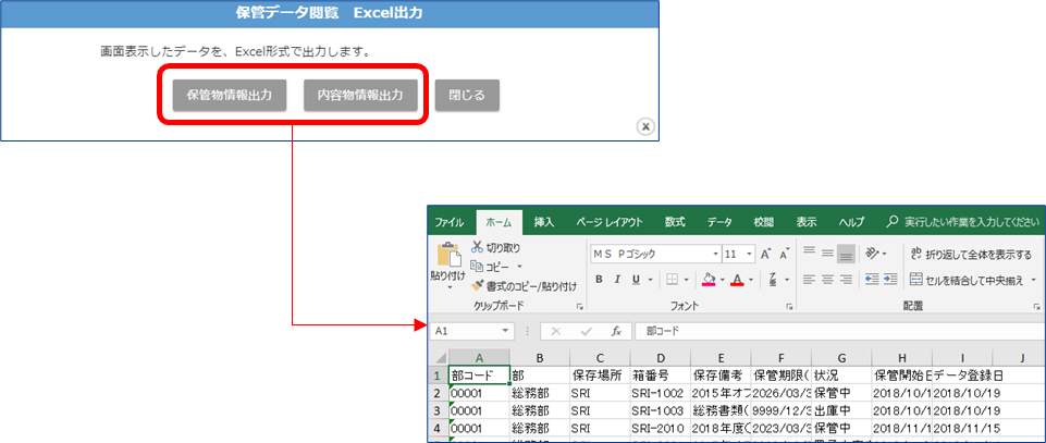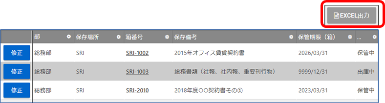 検索結果が表⽰されたら、画面右上の「EXCEL出力」をクリック
