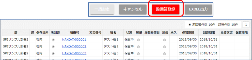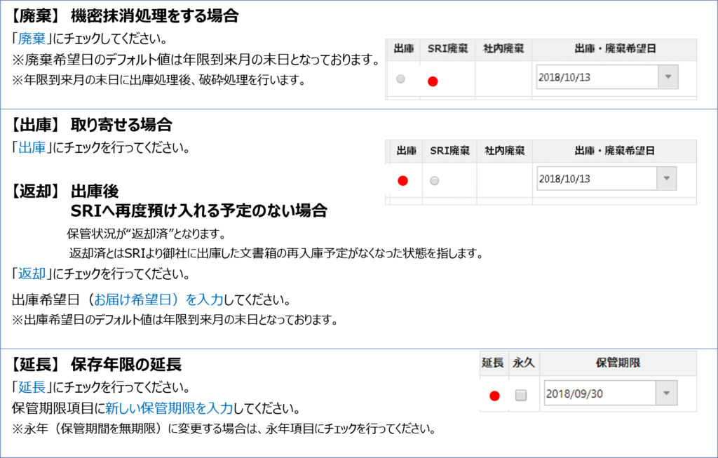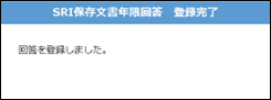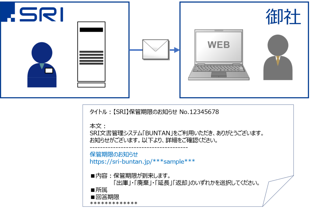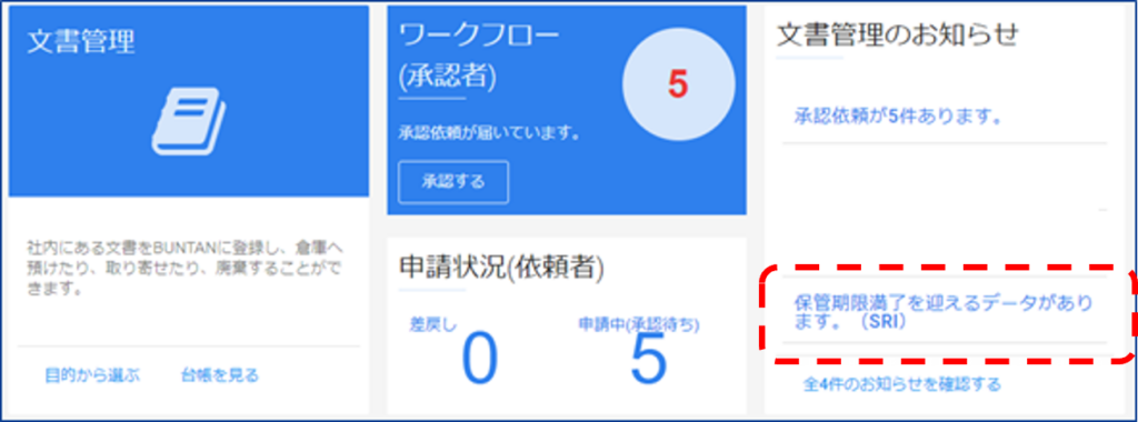 BUNTANユーザーガイド 【その他】管理機能 保管期限のお知らせに回答する 2024.06.06 2024.07.25 ●STEPごとに手順を確認する1.保管年限切れのお知らせ2.インフォメーション画面「文書管理のお知らせ」3.部を選択4.保管期限満了⼀覧より「回答登録」5.登録完了 ●STEPごとに手順を確認する 1.保管年限切れのお知らせ 翌⽉末までに保管期限満了⽇が到達する保管⽂書のお知らせがメールにて届きます 2.インフォメーション画面「文書管理のお知らせ」 TOP:インフォメーション画面の文書管理のお知らせ「年限切れを迎える文書があります」をクリック またはメニュー「目的から選ぶ>期限回答する>管期限満了通知について回答する(SRI)」をクリックご依頼フォーム⼊⼒画⾯に移ります。 3.部を選択 対象の部を選択し、「検索」をクリック 4.保管期限満了⼀覧より「回答登録」 保管期限満了⼀覧よりデータ番号毎に回答を選択し、「回答登録」をクリック 5.登録完了