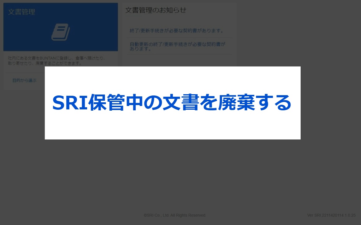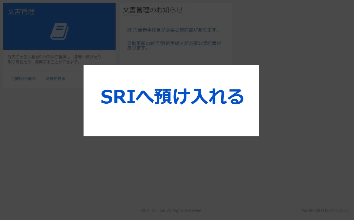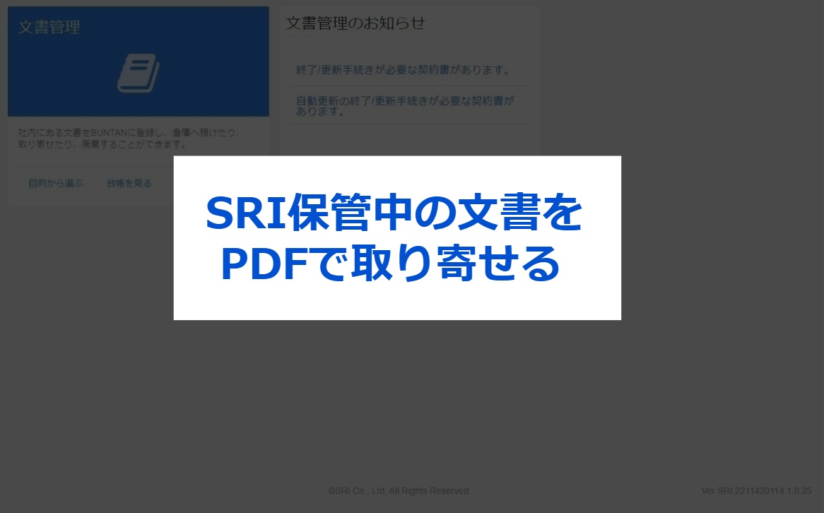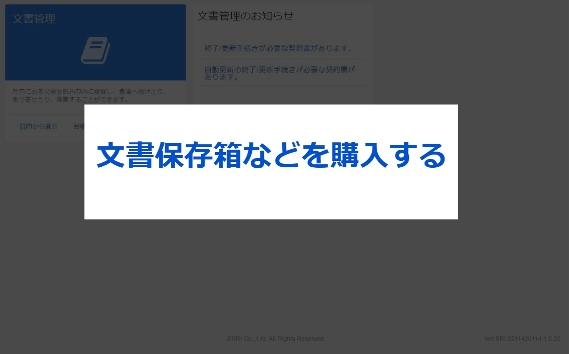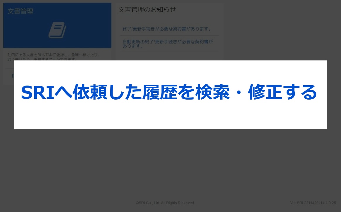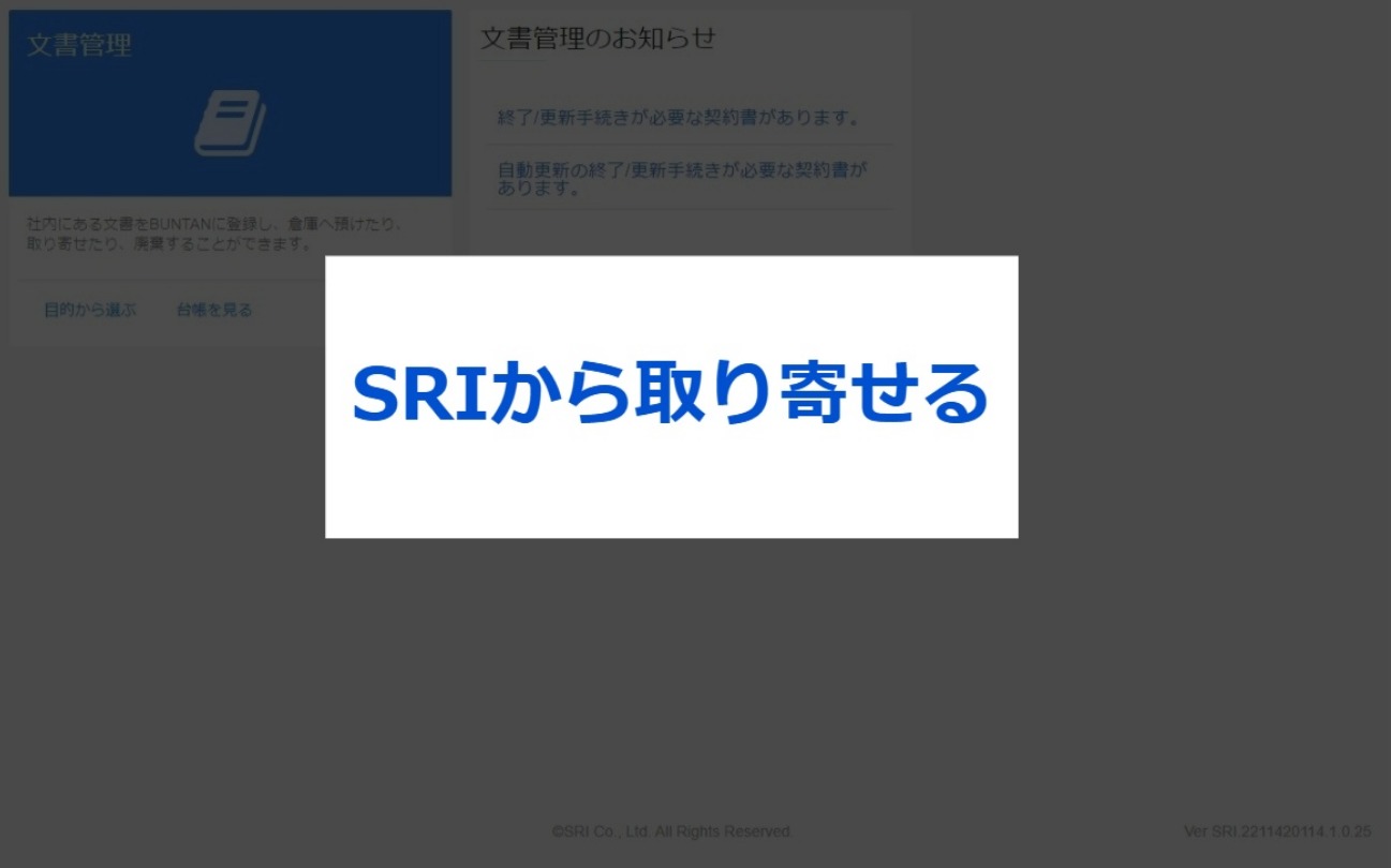 無料トライアルご利用方法について 3.その他メニュー紹介 2023.11.27 2024.06.06 ⑴はじめに⑵SRIへ預け入れる(入庫依頼)⑶SRIから取り寄せる(出庫依頼)⑷SRI保管中の文書を廃棄する(廃棄依頼)⑸SRI保管中の文書をPDFデータで取り寄せる(電送依頼)⑹文書保存箱などを購入する(備品依頼)⑺依頼履歴を確認・修正する ⑴はじめに こちらは本プランの申し込み後にご利用いただけるメニューとなっております。各種ご依頼については、17時を締切としております。なお、集配送を伴うご依頼の場合は、17時までのご依頼で翌営業日のご選択が可能です。(17時以降になると、翌々営業日扱いとなります。) ※受付完了メールの通知をもって登録完了となります。 ※お客様の運用・設定、及び配送場所などの諸条件により翌々営業日のお届けとなることがございます。 ⑵SRIへ預け入れる(入庫依頼) お手元にある契約書をSRIで保管をする(入庫)ときの操作手順です。 ⑶SRIから取り寄せる(出庫依頼) SRIにある契約書を取り寄せる(出庫)ときの操作手順です。 ⑷SRI保管中の文書を廃棄する(廃棄依頼) SRIに保管してある文書をSRIで廃棄するときの操作手順です。 ⑸SRI保管中の文書をPDFデータで取り寄せる(電送依頼) SRIに保管してある文書をPDFデータで取り寄せるときの操作手順です。依頼後2~3時間程度で、BUNTANにてご確認いただけます。 なお、他のお客様からのご依頼が重なり混み合ってきた場合には、お時間をいただく場合もございます。また、”受付締切時間間際のご依頼”や”対象の箱数の件数が多い”によっては、翌日までお時間をいただく場合がございますので、ご了承ください。 ⑹文書保存箱などを購入する(備品依頼) 文書保存箱などの備品を購入するときの操作方法です。ご注文希望の商品によっては、1セット10枚といったセット販売となりますので、ご注意ください。 ⑺依頼履歴を確認・修正する 依頼した履歴を確認・修正するときの操作方法です。「修正」ボタンが表示されている場合には、お客様にて修正が可能です。「修正」ボタンが表示されていない場合には、SRIまでお問い合わせください。